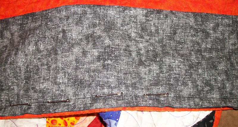 I lined up the cut edge along the top of the quilt and used my quilt basting pins to pin along the seam. Sure the pins show from the front up close, but do you see them in the pictures up above?