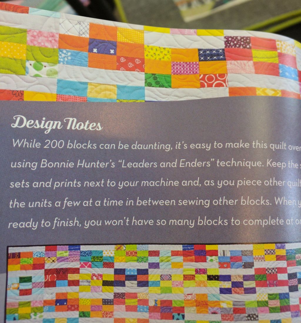 Last night I attended The Kansas City Modern Quilt Guild meeting. The guest speaker was Angela Walters. She and Jenifer Dick recently released a new book “Nine-Patch Revolution: 20 Modern Quilt Projects”. I purchased the book prior to the meeting and was flipping through it and I spotted a reference to Bonnie Hunter!